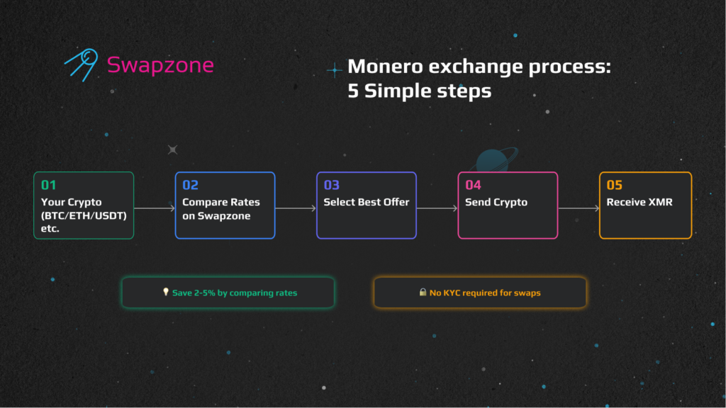 Now you’re ready to start swapping for XMR. Check Swapzone exchange rates for the best deals on BTC to Monero, USDT to Monero, ETH to Monero, and 1,500+ other trading pairs. Whether you’re new to Monero or trading large amounts, expect competitive rates and secure transactions in just a few clicks.