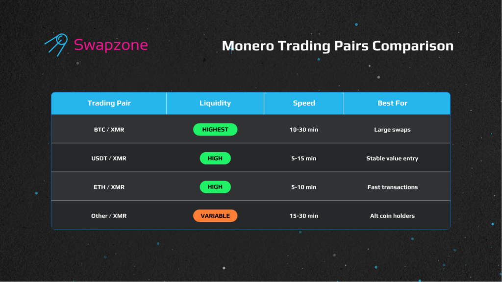 BTC/XMR is the most popular trading pair. When you swap Bitcoin for XMR, you move from the most surveilled cryptocurrency to the most private. That’s significant. Bitcoin’s massive liquidity ensures competitive Monero exchange rates.
