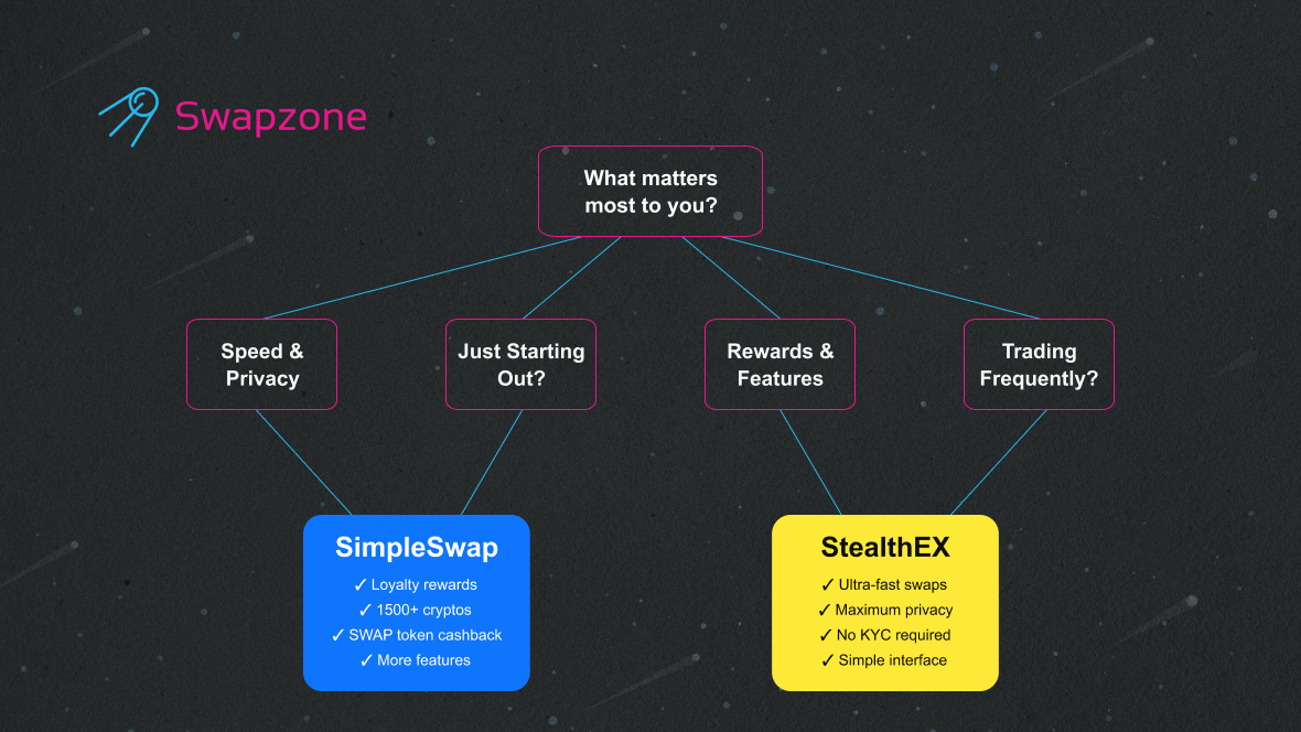 Choose SimpleSwap over StealthEX if you value simplicity and rewards. SimpleSwap’s loyalty program gives incentives for frequent traders so it’s great for those who will make multiple transactions. Plus the fixed rates can give users more predictability in their exchanges which is important for portfolio management. If you prefer user-friendly interface and reliable support, SimpleSwap is the way to go.
