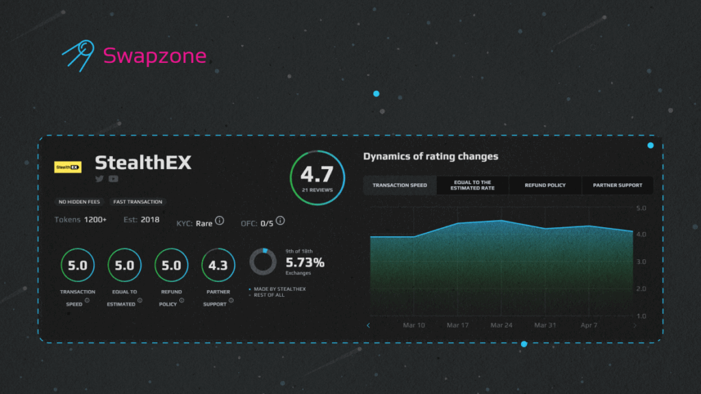Ready to swap crypto with complete control? At Swapzone, we’re proud to feature StealthEX in our Exchange Circle because they deliver what our users value most: freedom, speed, and security. Whether you’re making your first crypto swap or your thousandth, StealthEX prioritizes your financial sovereignty through their non-custodial approach. Try StealthEX through Swapzone today and discover why we’ve partnered with them to bring you the best exchange options. Stay tuned for our next Exchange Circle feature showcasing another innovative partner reshaping the crypto exchange landscape.
